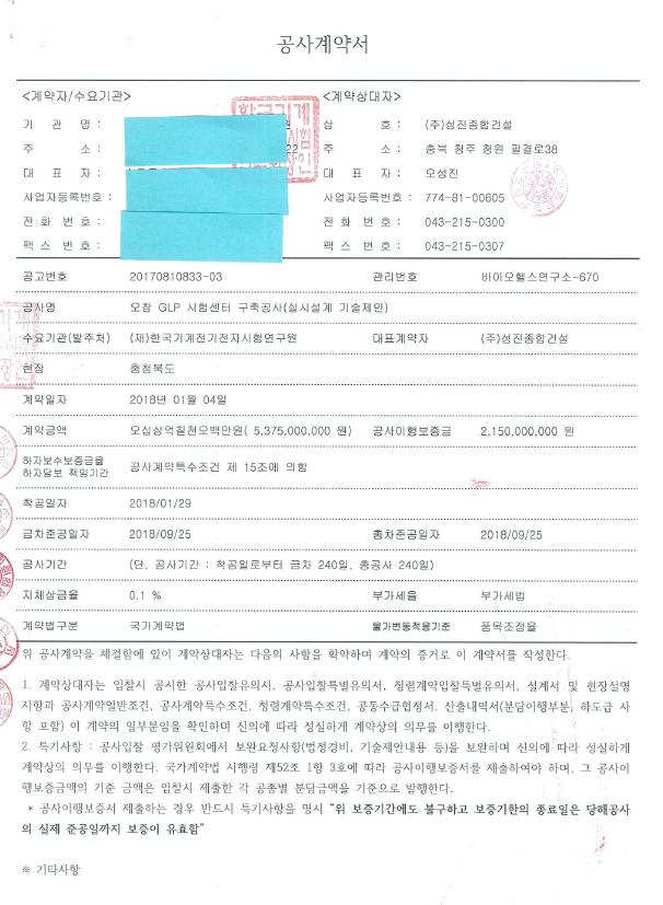 "경축" (주)성진종합건설 "오창GLP 시험센터 구축공사"계약체결