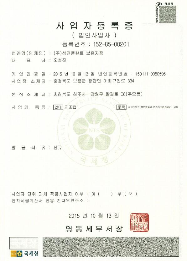(주)성진플랜트 보은지점을 등록하였습니다.